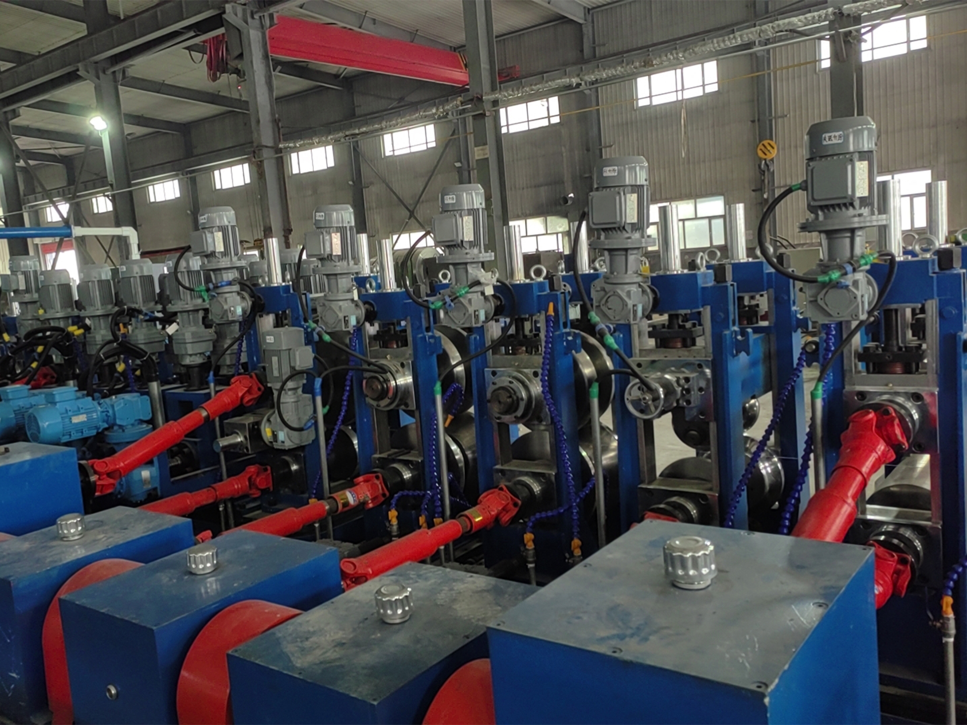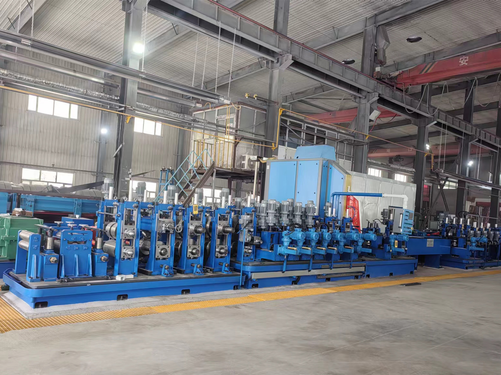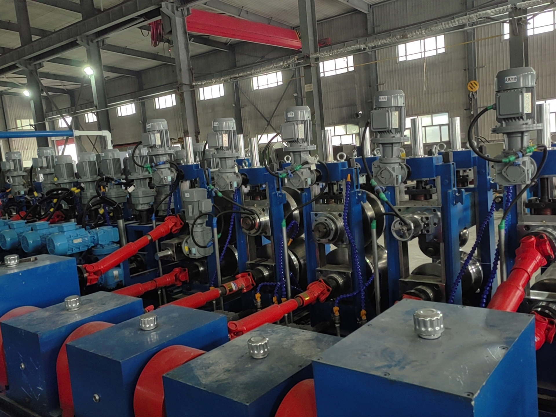 整条焊管线生产线实现了由交流电机远程控制或PLC伺服电机控制的高自动化辊位调整。